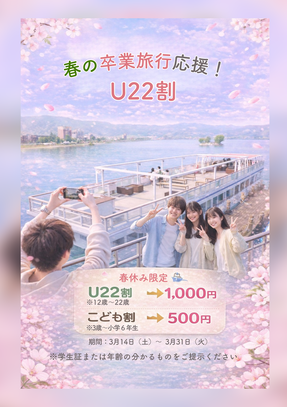 卒業旅行や春休みのお出かけにぴったり! U22割(12〜22歳)で 遊覧船が 1,000円 に✨ 友達と写真を撮ったり📸 湖の景色をのんびり眺めたり。 春の諏訪湖で ちょっと特別な時間を過ごしてみませんか?🌸 【春休み限定】 U22割(12〜22歳) ▶ 1,000円 こども割(3歳〜小6) ▶ 500円 📅期間 3月14日〜3月31日 ※年齢確認できるものをご提示ください